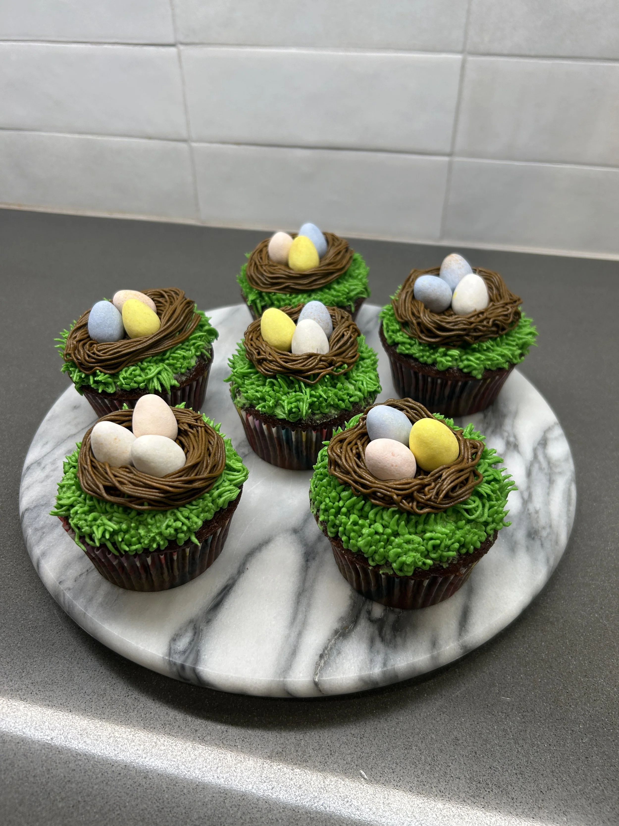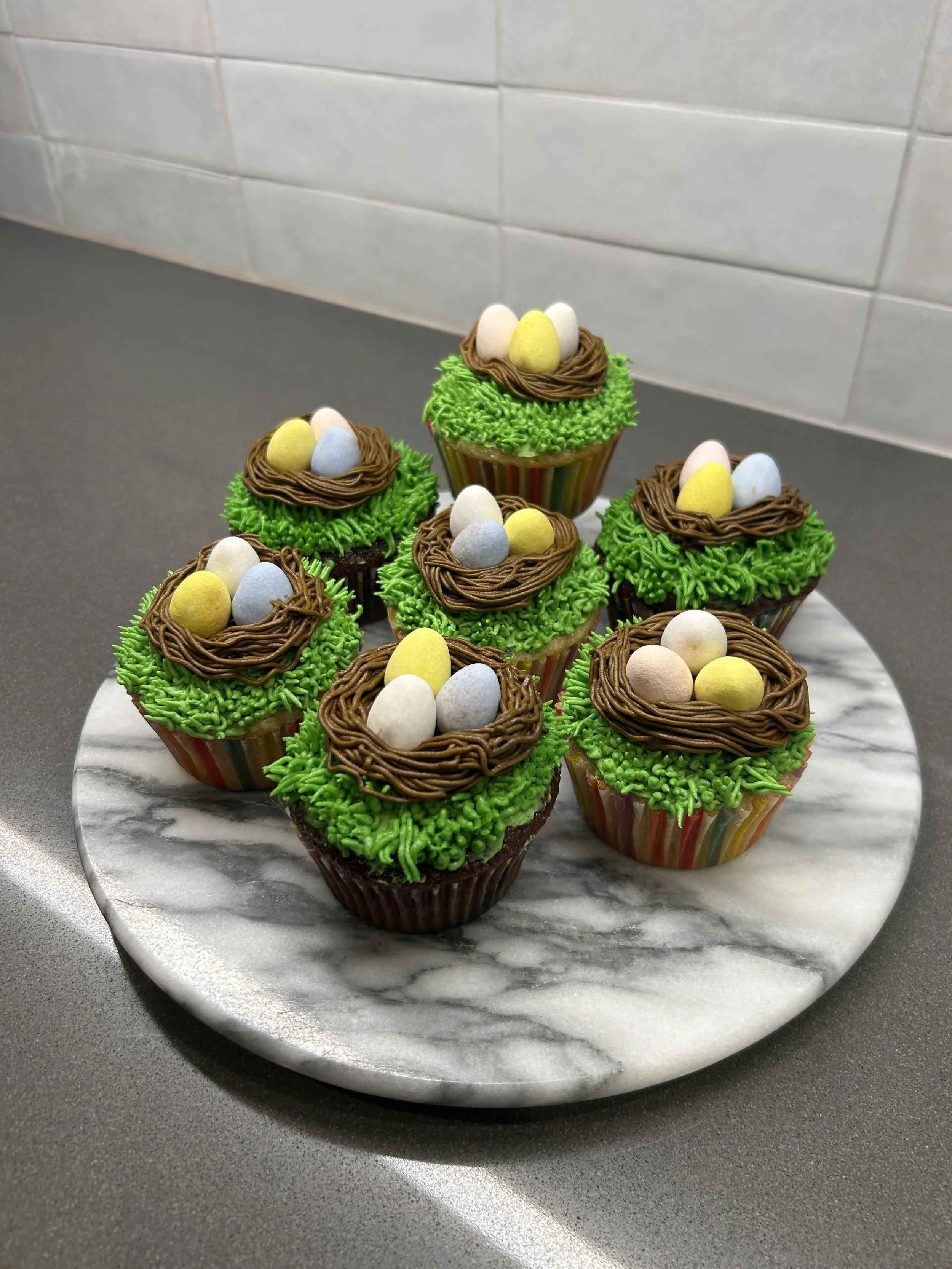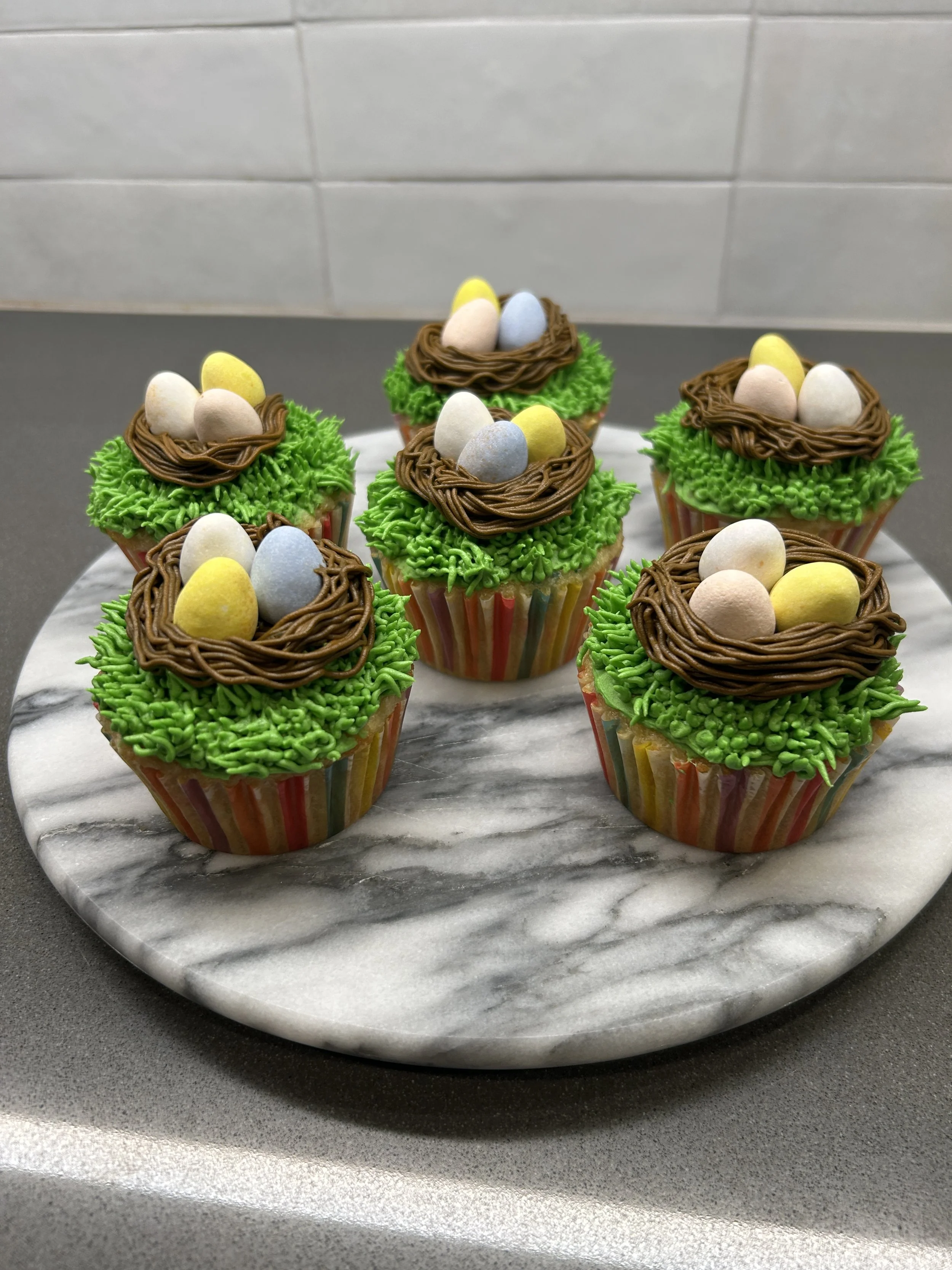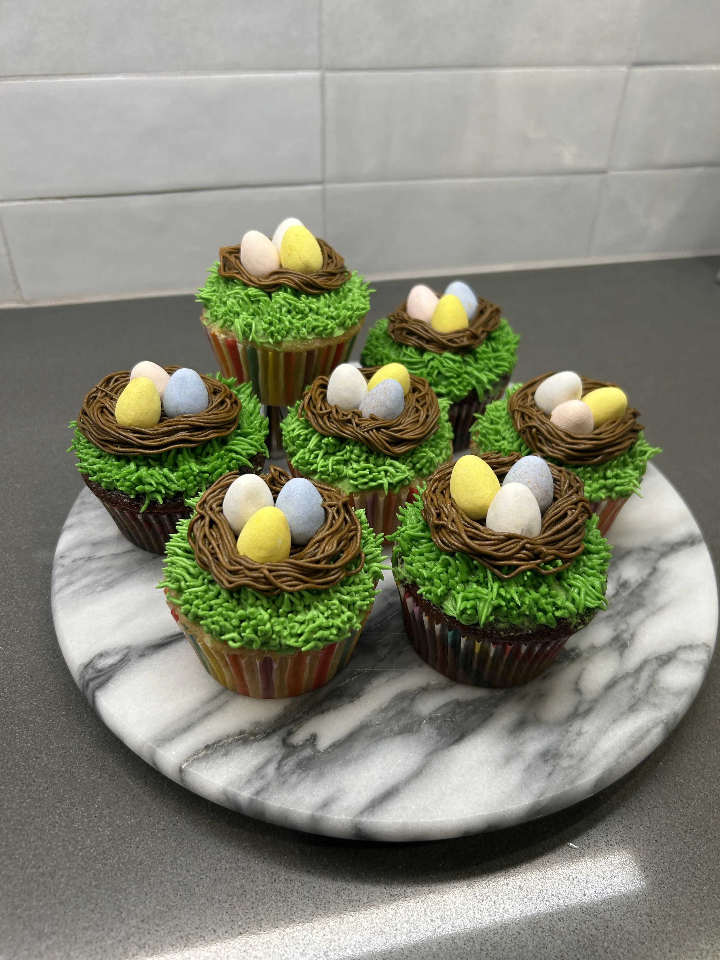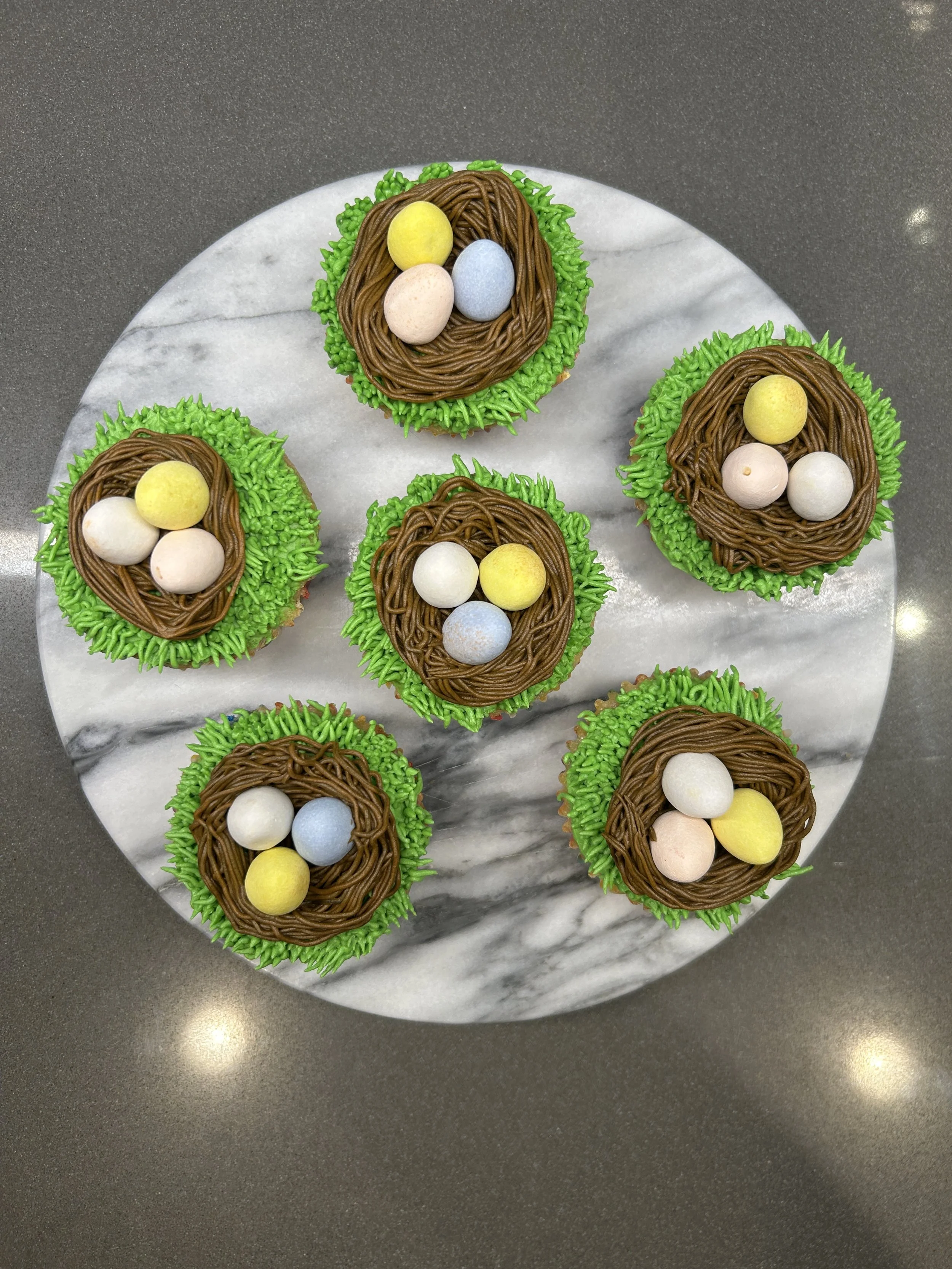 Your choice of Vanilla, Chocolate, or Both cupcakes, with a beautiful vanilla frosting and Cadbury milk chocolate, candy coated mini eggs to look like and egg nest.